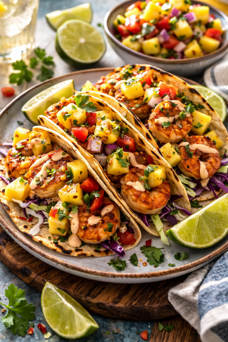 Delicious shrimp tacos topped with fresh pineapple salsa, perfect summer flavor experience