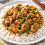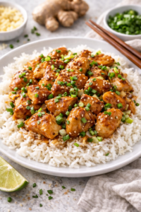 Aromatic ginger garlic chicken served with soft, fragrant jasmine rice, perfectly balanced flavors.