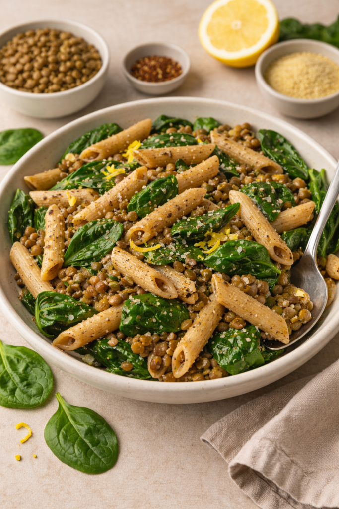 Pasta, Lentils, Spinach, with a Lemony Twist