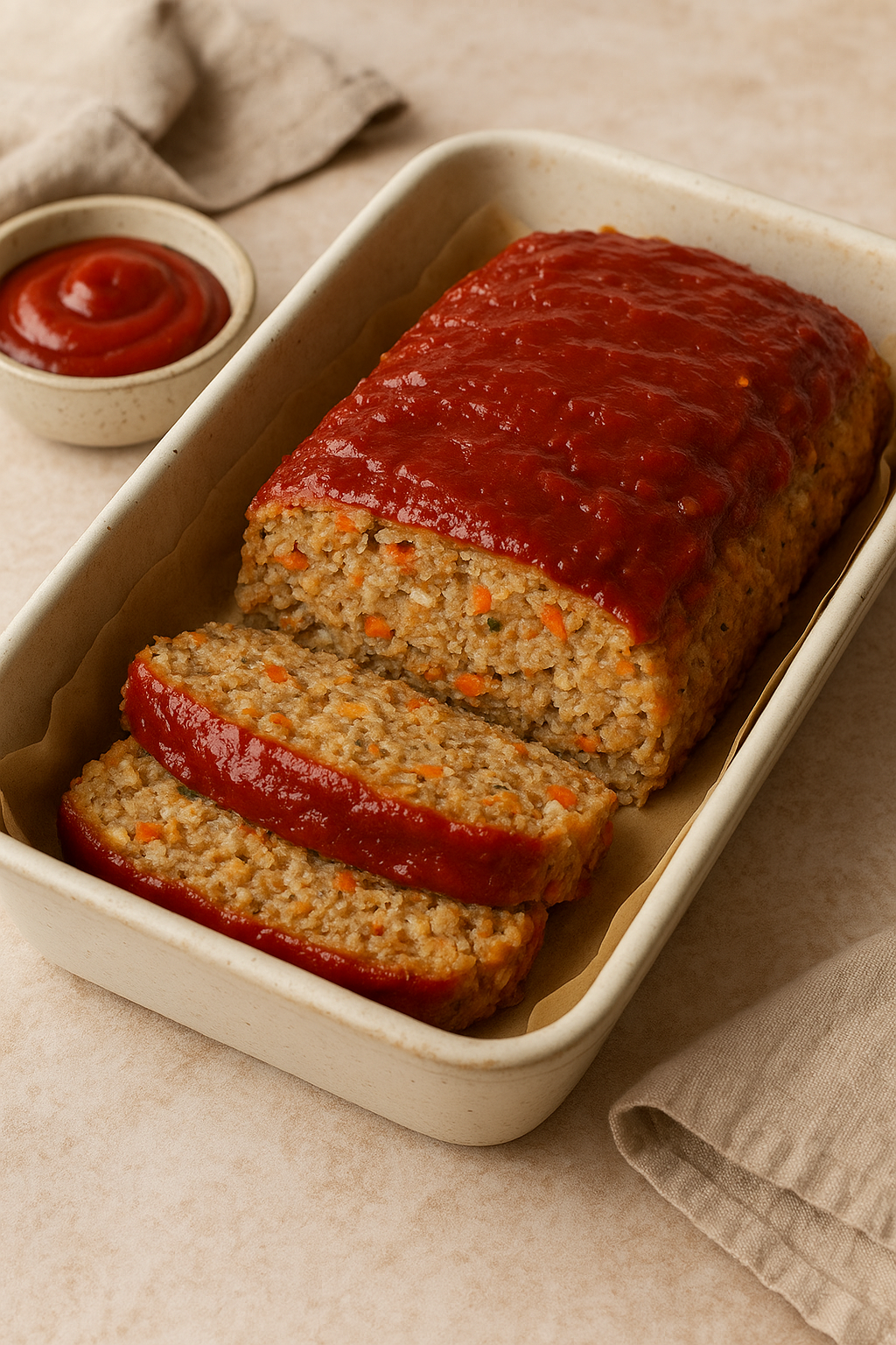 3. Press mixture into the loaf pan and smooth the top. Spread 2 tablespoons ketchup on top.
